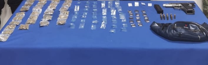 Por tal motivo, por medio del altoparlante se les indicó que se detuvieran y al realizar una inspección les fueron encontradas 28 bolsitas de plástico transparente tipo ziploc que en su interior contiene hierba verde y seca con las características similares a la marihuana, 44 bolsitas transparentes que en su interior contenía fragmentos transparentes con las características similares a la piedra, 4 bolsitas transparentes en su interior contenía polvo blanco con las características similares a la cocaína, 14 bolsitas transparentes en su interior contenía polvo blanco con las características similares al cristal, así como un arma de fuego con un cargador y 09 cartuchos útiles calibre 9mm.