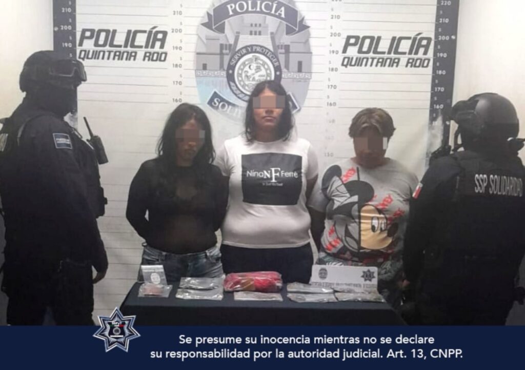 En otro punto de la ciudad fueron asegurados Cinthia “N” de 23 años y Antonia “N” de 43 años, originarias de Tabasco, así como Roxana “N” de 22 años, oriunda de este estado, a quienes se le aseguraron 97 envoltorios con posible metanfetamina y 2 con lo que parece marihuana luego de ser sorprendidas intercambiando los envoltorios sobre la calle Chechén con avenida Gran Bahía de la colonia In House.
