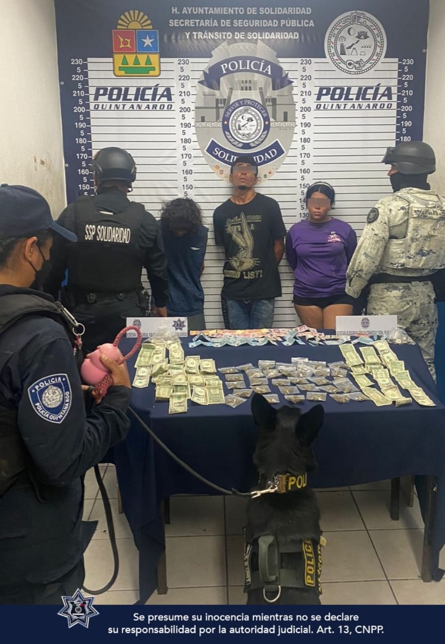 Playa del Carmen (Marcrix Noticias).- Policías de la Secretaría de Seguridad Pública y Tránsito Municipal de Solidaridad y elementos de la Guardia Nacional, aseguraron a tres personas en posesión de 32 bolsitas con posibles narcóticos y dinero en efectivo, cuando patrullaban en la colonia Colosio.