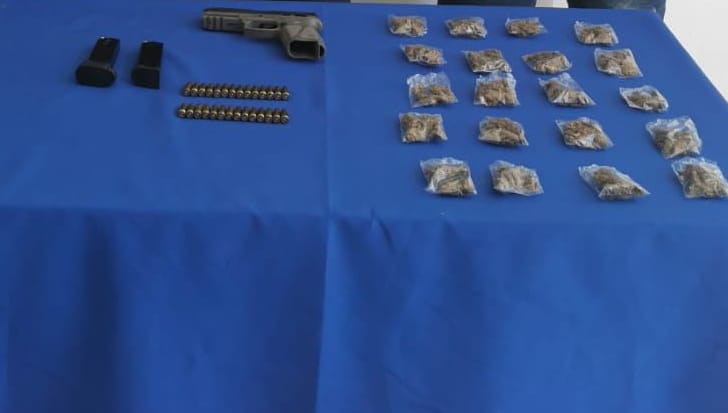 Asimismo, al realizar una inspección, les fue encontrada un arma de fuego con 28 cartuchos útiles, así como 20 bolsas pequeñas con mariguana.