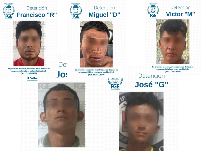 CANCÚN.- La Fiscalía General del Estado de Quintana Roo informa que Agentes de la Policía de Investigación lograron la detención de José “J”, José “G”, Miguel “D”, Francisco “R” y Víctor “M” por su probable participación en el delito de homicidio en agravio de dos víctimas del sexo masculino, cuyos cuerpos sin vida fueron localizados en el fraccionamiento Paseos Kusamil del Municipio de Benito Juárez.