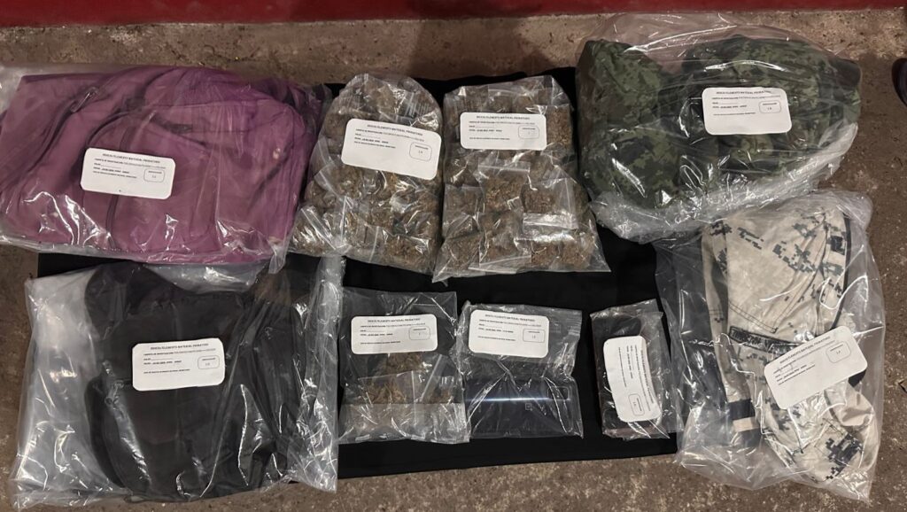 Se les decomisaron: 154 bolsitas de plástico transparentes con hierba seca color verde con las características similares a la marihuana, un vehículo de color gris de la marca Nissan tipo X-Trail con placas del estado de Quintana Roo, una camisola de la guardia nacional y un uniforme de la secretaria de la defensa nacional.