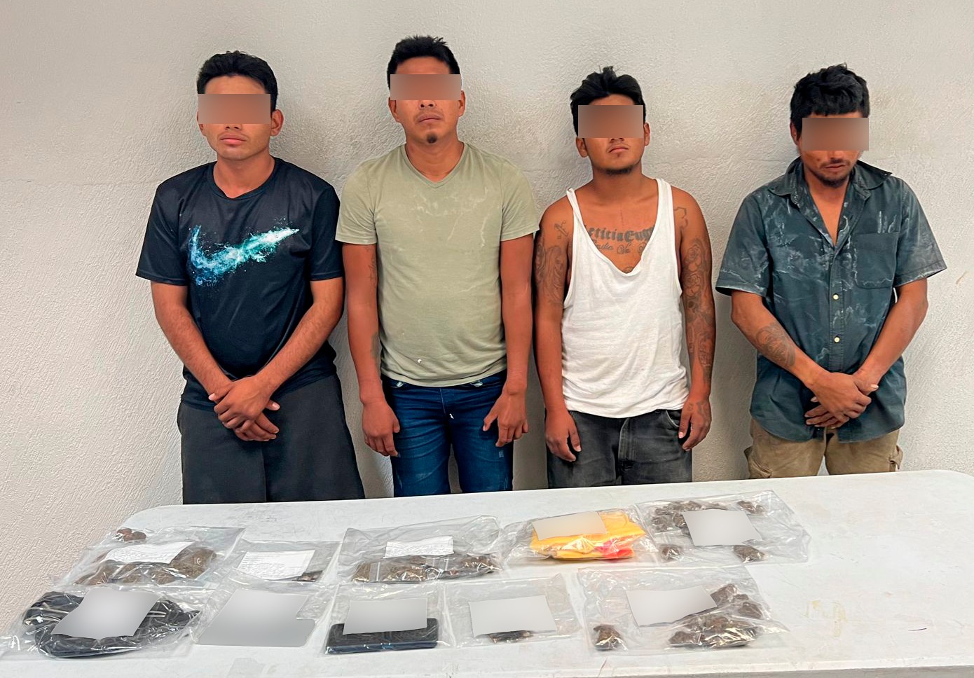 Agentes de la Fiscalía Especializada en Combate al Delito de Narcomenudeo lograron la captura en flagrancia de cuatro personas del sexo masculino, en la Chaca con avenida Gran Bahía, en la colonia irregular In House del municipio de Solidaridad.