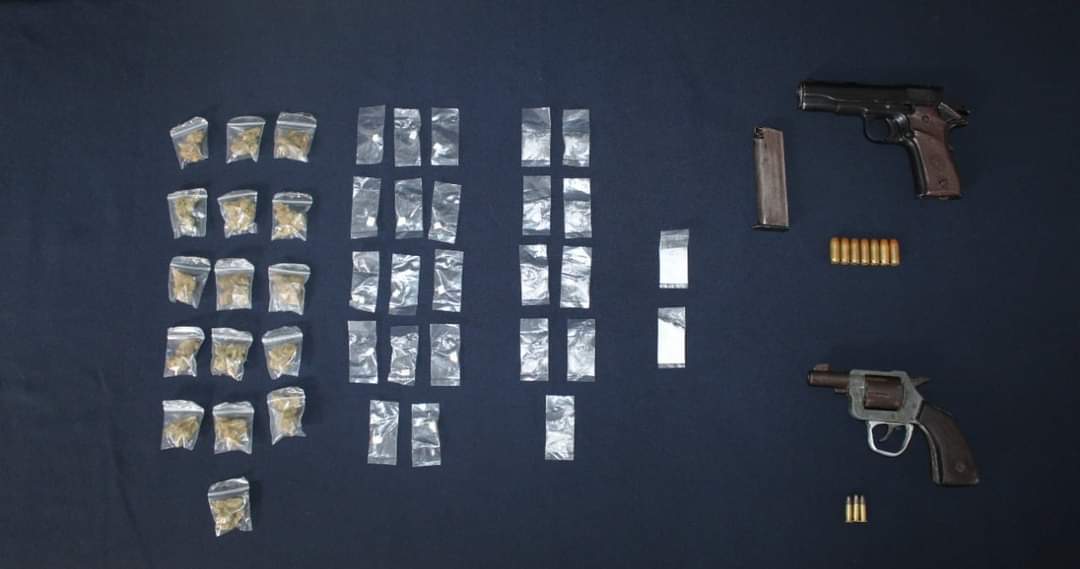 Los oficiales les hicieron una revisión de rutina y les aseguraron dos armas de fuego, 16 dosis de marihuana, 14 de crack, 9 de cristal y otras dos dosis de cocaína.
