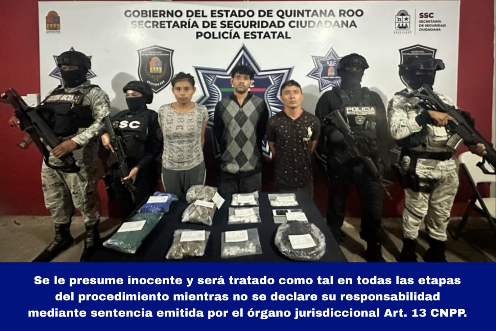 Cancún (Marcrix Noticias).- En recorridos de vigilancia en el Fraccionamiento Villas Otoch Paraíso, en la ciudad de Cancún, elementos de la Secretaría de Seguridad Ciudadana en coordinación con la Guardia Nacional, se percataron de tres personas, quienes estaban paradas junto a un mototaxi y tenían entre sus manos múltiples bolsitas de plástico transparentes, que en su interior se apreciaba contenían cada una, vegetal de color verde con las características similares a la droga comúnmente conocida como marihuana y otras con fragmentos sólidos cristalinos.