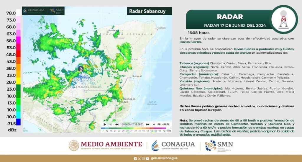 Cancún (Marcrix Noticias).- Durante esta noche y madrugada del martes, el Potencial Ciclón Tropical Uno en el sur del Golfo de México y la vaguada monzónica sobre el sureste mexicano y el sur de la Península de Yucatán, mantendrán el temporal de lluvias intensas a puntuales torrenciales en Chiapas, Tabasco, Campeche, Yucatán y Quintana Roo.
