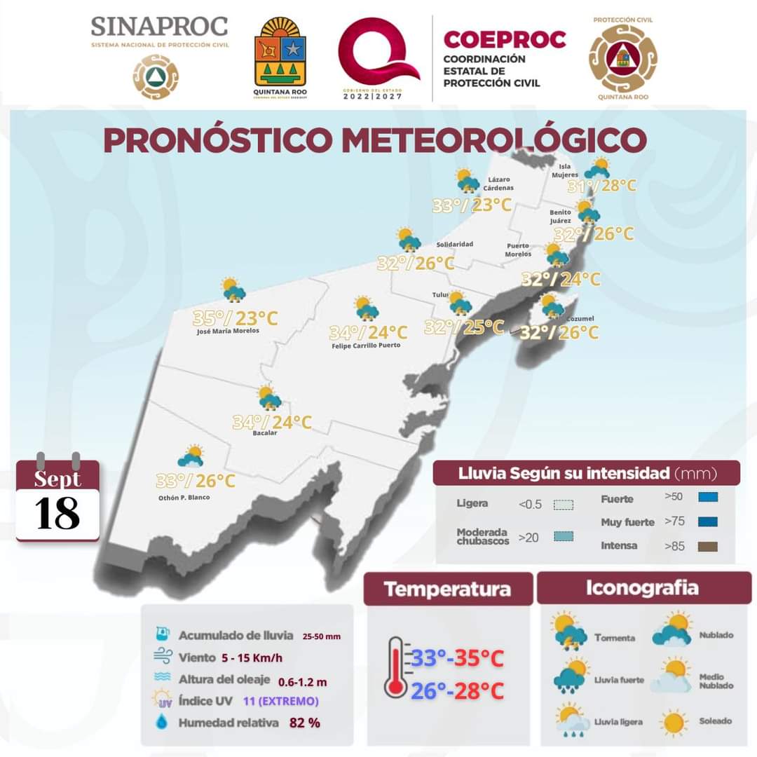 8.- FELIPE CARRILLO PUERTO.- Cielo medio nublado, lluvias con intervalos de chubascos acompañados de actividad eléctrica. Ambiente muy caluroso a bochornoso. Viento del este y sureste de 18 km/h con rachas más fuertes. Temperatura Máxima: 36/38 GC, Temperatura Mínima para mañana: 22/24 GC. Sensación Térmica: 41 GC. Presión Atmosférica: 1010 hPa. Salida del Sol: 06:42 h. Puesta del Sol: 18:52 h.