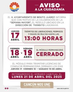 Con motivo de la Semana Santa, el módulo de atención ciudadana ubicado en la Dirección de Tránsito ajustará temporalmente su horario de servicio.