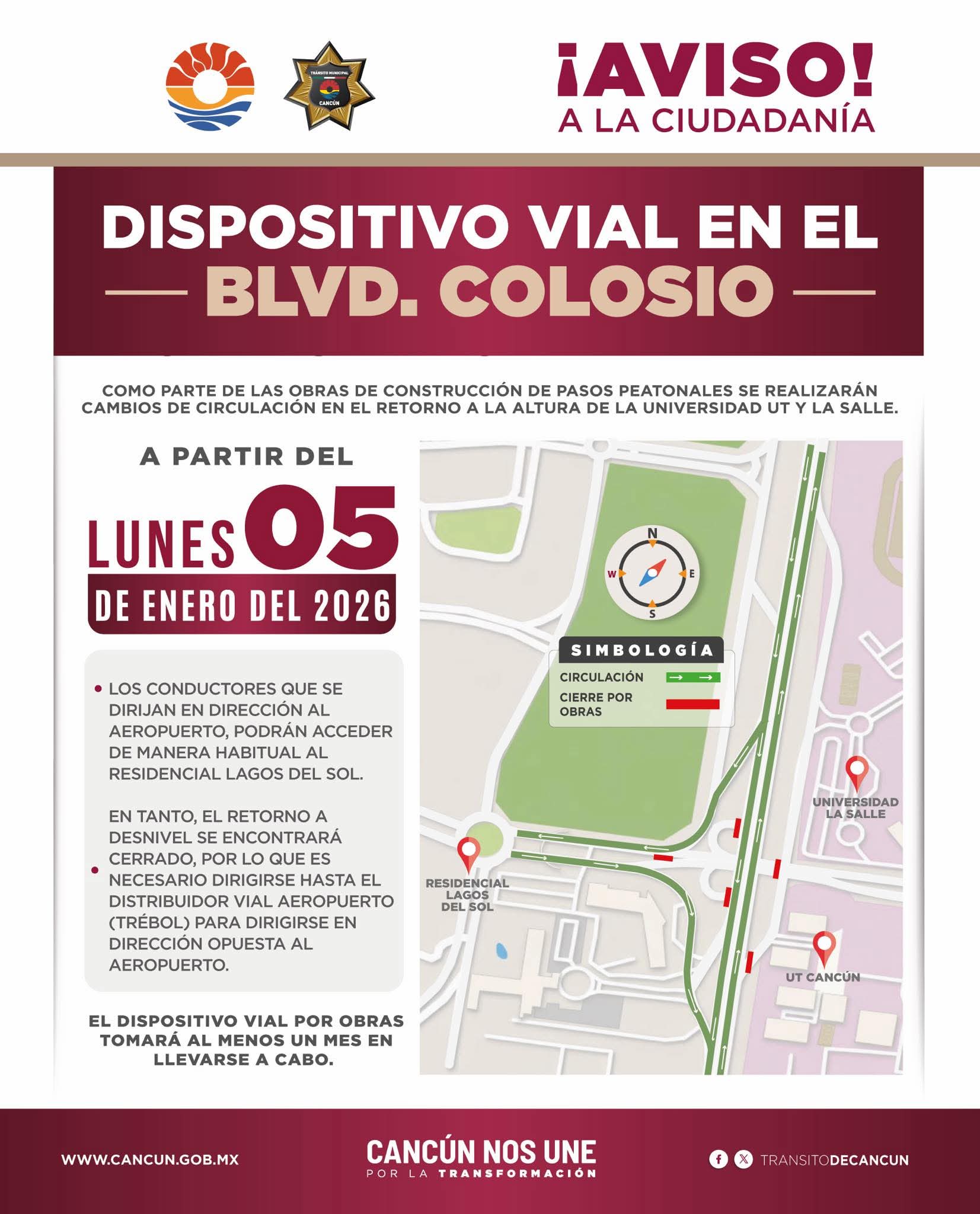Cancún(Marcrix Noticias).- A partir del lunes 5 de enero de 2026 entrará en operación un dispositivo vial temporal en el Bulevar Luis Donaldo Colosio, a la altura de la Universidad Tecnológica de Cancún (UT Cancún) y la Universidad La Salle, debido a trabajos de construcción de pasos peatonales en la zona.