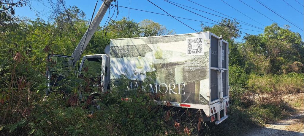 Quintana Roo (Marcrix Noticias).– Un camión de mudanza se salió de la carretera federal 307 y derribó un poste de la Comisión Federal de Electricidad (CFE), en un accidente registrado en el tramo Playa del Carmen–Tulum, a la altura del cenote Dos Ojos.