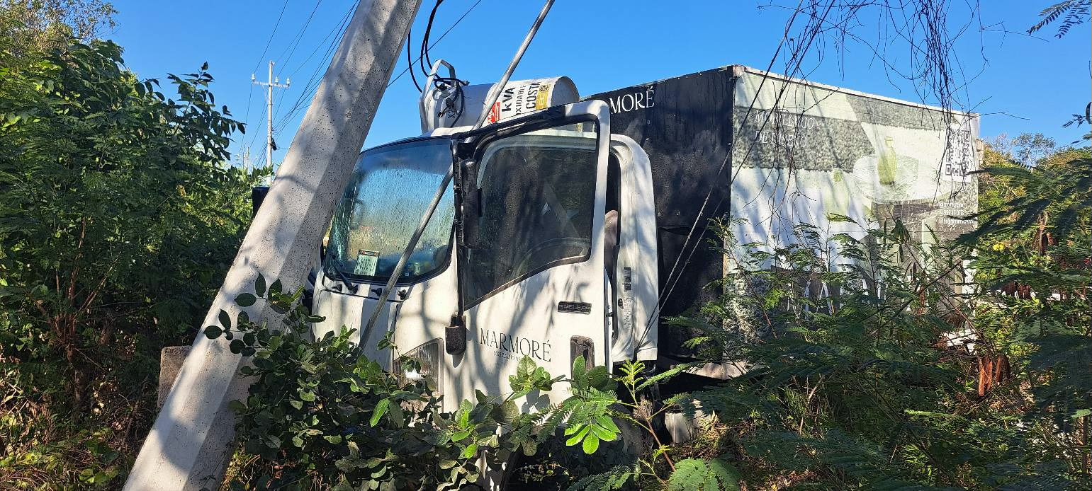 Quintana Roo (Marcrix Noticias).– Un camión de mudanza se salió de la carretera federal 307 y derribó un poste de la Comisión Federal de Electricidad (CFE), en un accidente registrado en el tramo Playa del Carmen–Tulum, a la altura del cenote Dos Ojos.
