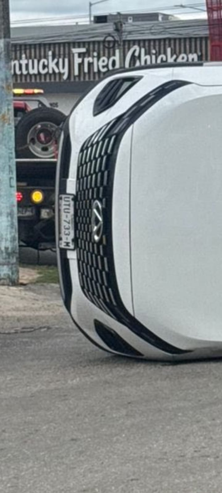 Chetumal (Marcrix Noticias).- Tras la lluvia que ocurrió esta mañana en Chetumal, aconteció un accidente frente a la Terminal de Autobuses ADO, cuando la camioneta Infiniti color blanco se volcó en su costado izquierdo.