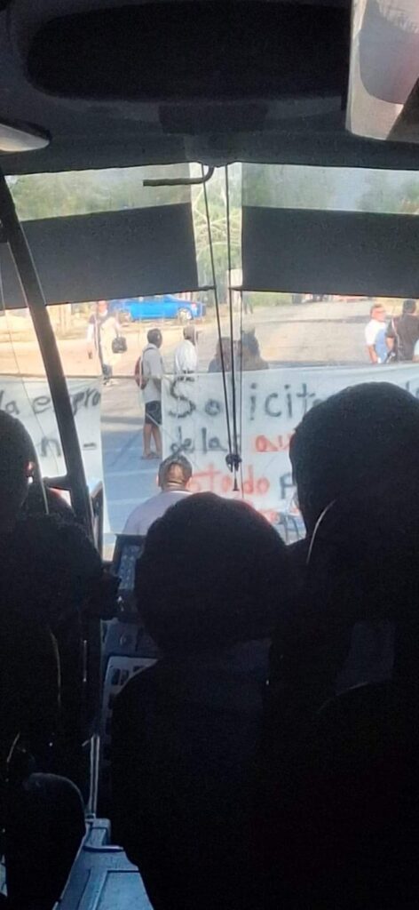 Un contingente de ejidatarios se mantiene en el sitio con mantas y pancartas de exigencia de pago de 13 millones de pesos y para ello colocaron piedras y troncos.
