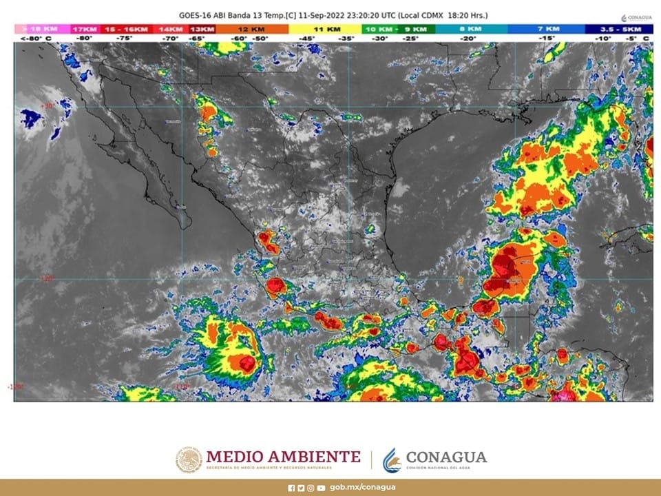 Un segundo canal de baja presión extendido en el noroeste, norte, occidente y centro de México, en combinación con ingreso de humedad del océano Pacífico e inestabilidad en niveles altos de la atmósfera, ocasionarán lluvias muy fuertes en zonas de Jalisco y Nayarit; fuertes en Colima, Estado de México, Michoacán y Morelos, y chubascos en Baja California, Ciudad de México, Chihuahua, Durango, Sinaloa, Sonora y Zacatecas.