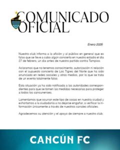 A través de un comunicado difundido en sus plataformas oficiales, el equipo cancunense aseguró que ni el club ni la administración del estadio tienen conocimiento, autorización o relación alguna con dicho evento, por lo que calificaron el anuncio como falso.