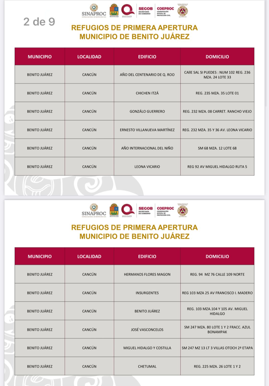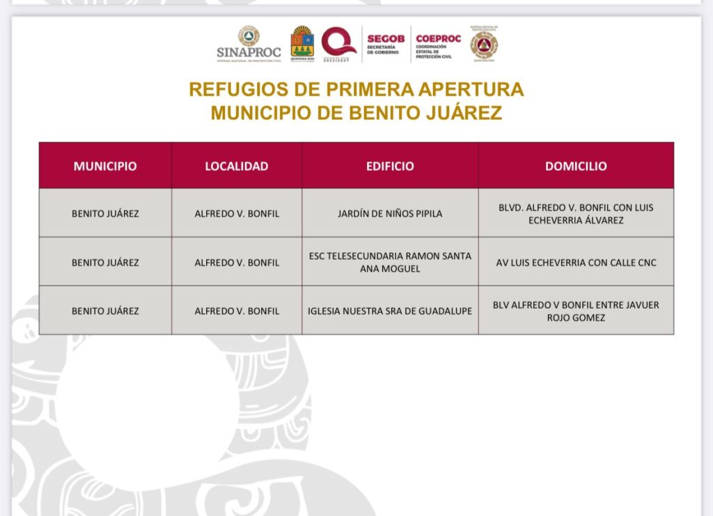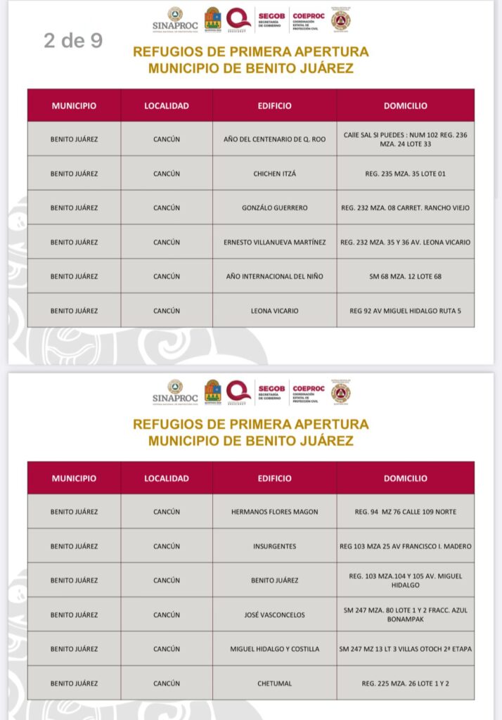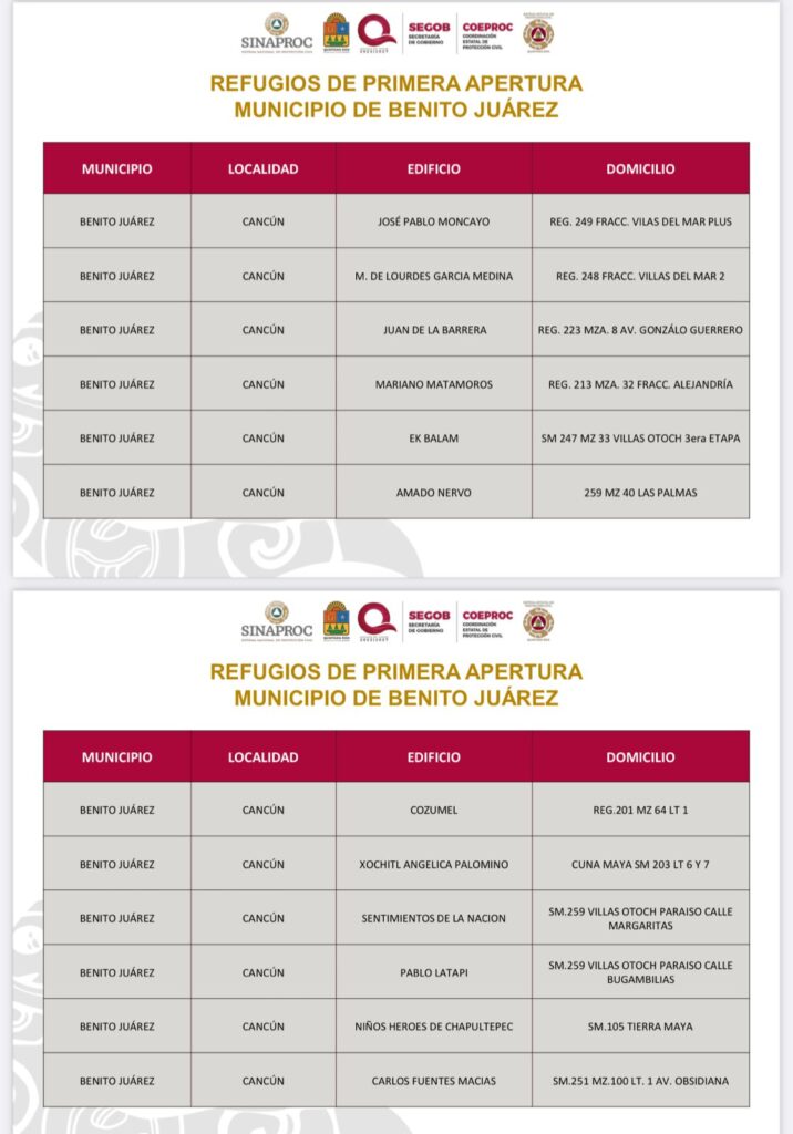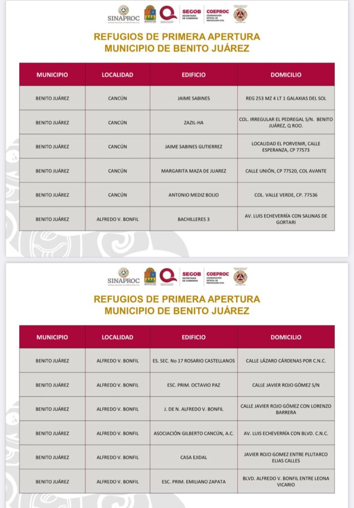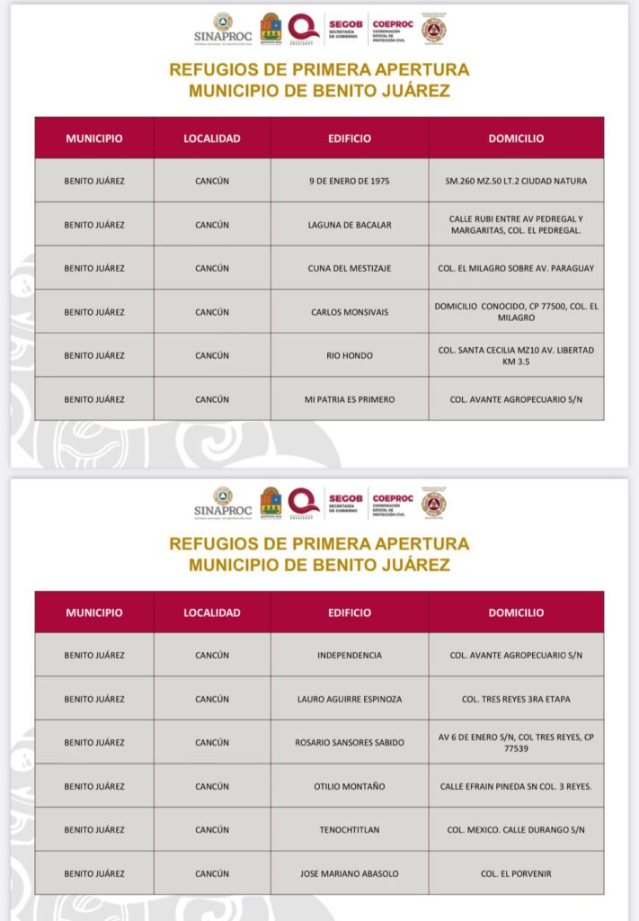 Uno de los refugios destacados es la escuela primaria “Chichén Itzá”, en la Supermanzana 235, con capacidad para 240 personas. Además, el refugio pet-friendly, ubicado en la Supermanzana 247, fraccionamiento Villas Otoch 3ª Etapa, estará divido por tamaños de mascotas (pequeñas, medianas y grandes), y contará con agua y servicios veterinarios a través de la clínica móvil canina y felina.