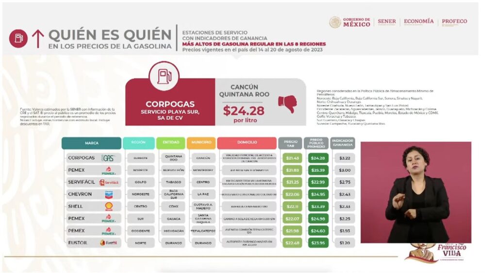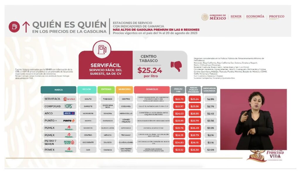 En su informe semanal ¿Quién es quién en los precios?, Ricardo Sheffield, titular de la Profeco, aseveró que la estación de servicio de esa ciudad vendió en 24.28 pesos el litro de la gasolina tipo regular, la más cara del sureste.