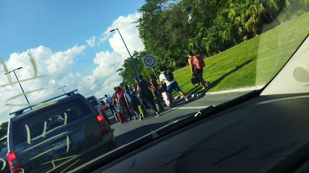 Un caos total se vive esta tarde rumbo al Aeropuerto Internacional de Cancún, por lo que turistas han decidido bajar de los vehículos y caminar para llegar y no perder sus vuelos.