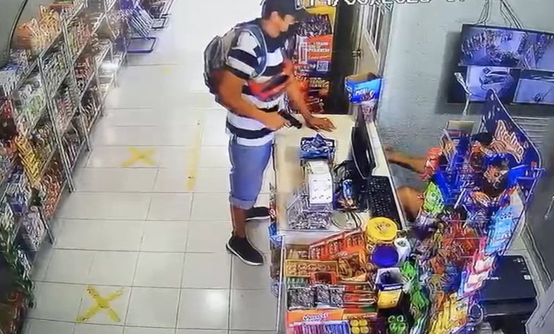 La persona que está atendiendo el establecimiento saca la caja registradora y la pone sobre el escritorio, entonces el asaltante toma el dinero, guarda la pistola y se retira muy tranquilamente tras cometer el robo.