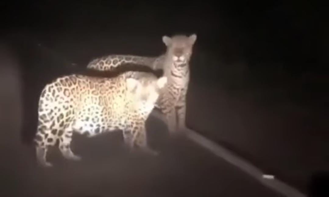 El conductor disminuyó la velocidad al notar la presencia de los felinos. En el video se puede ver cómo los jaguares avanzan con calma, iluminados por las luces del vehículo, en una escena casi cinematográfica.