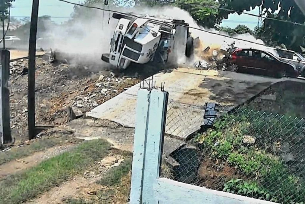 El accidente quedó registrado por cámaras de seguridad a la altura del fraccionamiento Estanzuela. La unidad pesada perdió el control y terminó volcada sobre la vía.