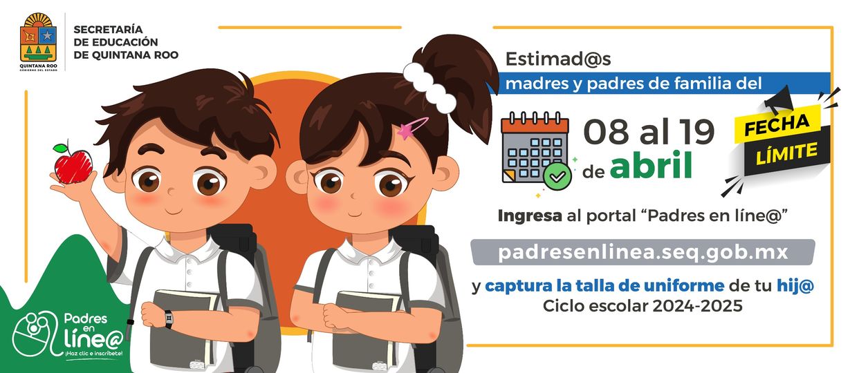 Chetumal (Marcrix Noticias)- La Captura de Talla de Uniformes del Ciclo Escolar 2024-2025 para estudiantes de escuelas públicas de preescolar, primaria y telesecundaria de Quintana Roo, abrirá nuevamente del 8 al 19 de abril de 2024. Esta es tu última oportunidad para capturar la información de tu hija e hijo.