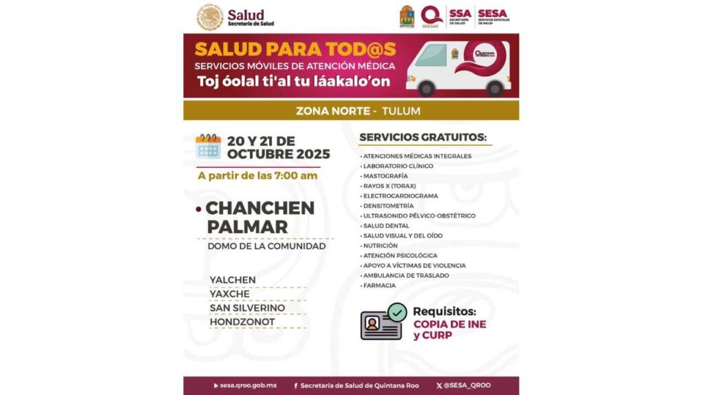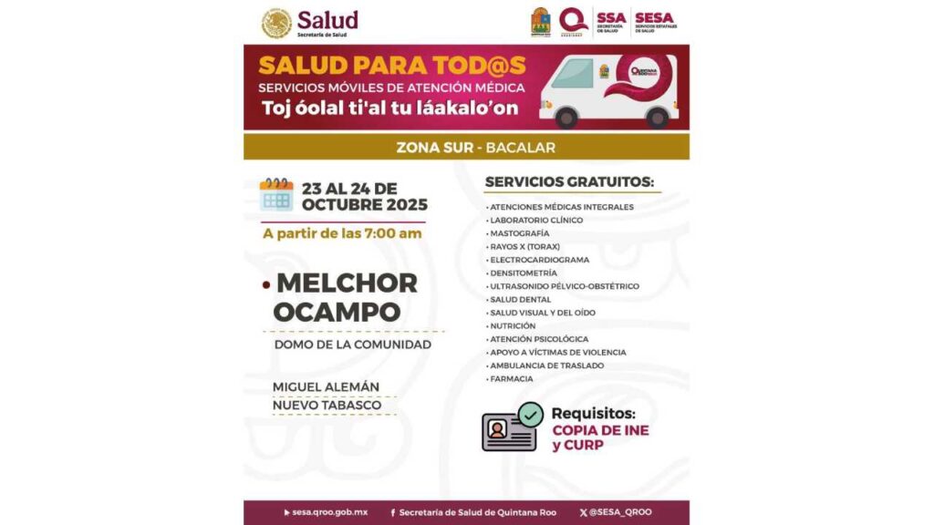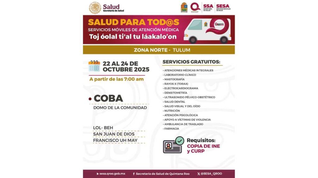 Cancún (Marcrix Noticias)-A partir de hoy, lunes 20 y hasta el próximo viernes 24 de octubre, las Caravanas de Salud “Salud para Tod@s” estarán visitando comunidades de los municipios de Tulum, Bacalar y José María Morelos, ofreciendo servicios médicos totalmente gratuitos para toda la población.