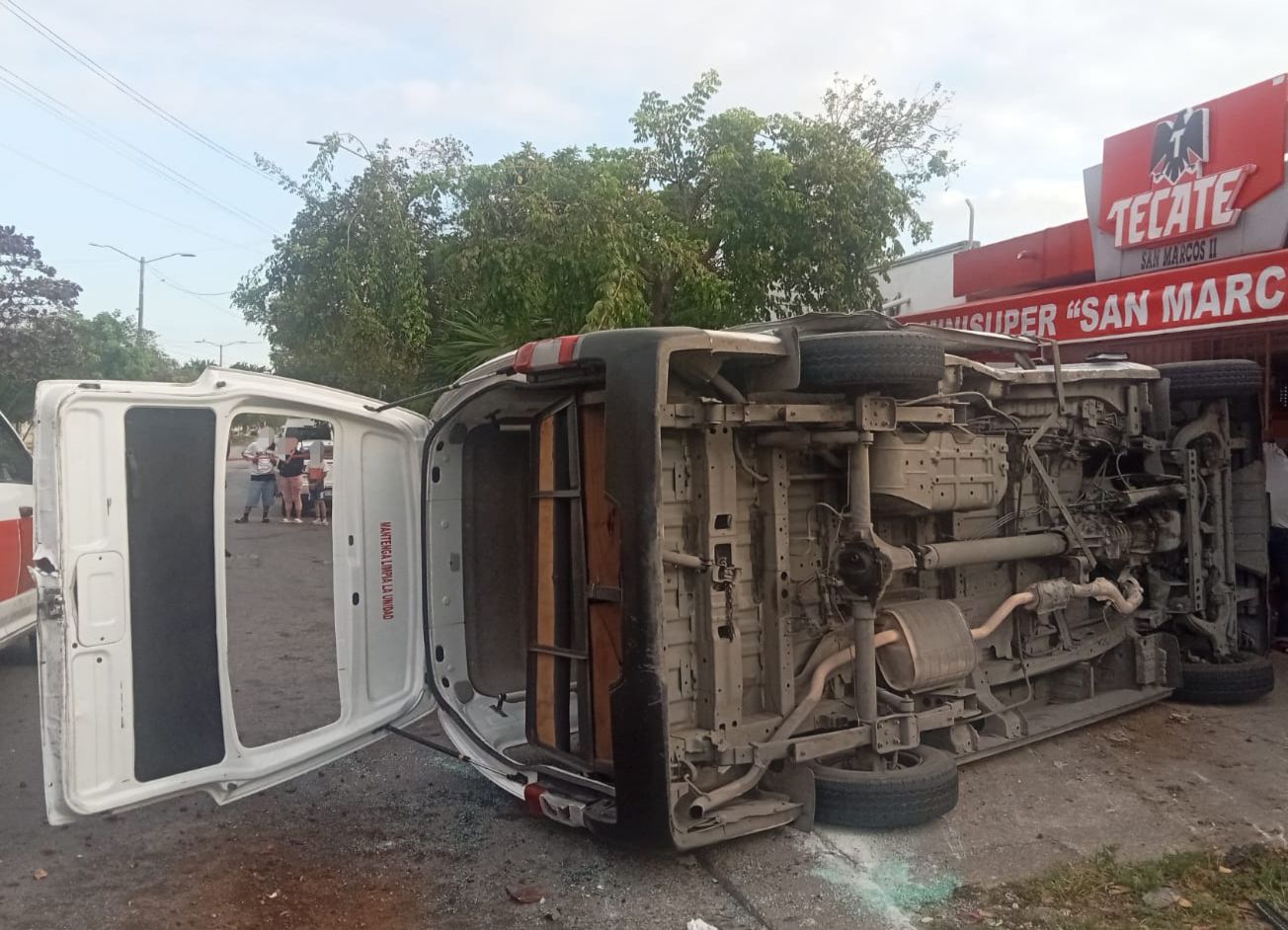 Coche impacta y vuelca a una Urvan en Avenida Tulipán de Cancún