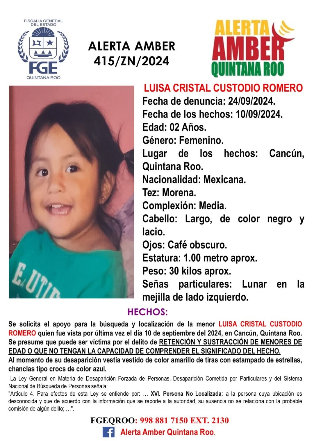 Familiares de la pequeña Luisa Cristal, de 2 años, piden apoyo ciudadano para encontrarla. La Fiscalía activó la Alerta Amber desde el 24 de septiembre. Cancún (Marcrix Noticias)-Familiares de Luisa…