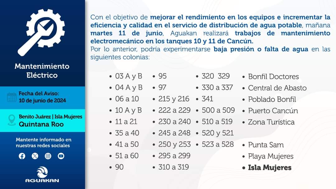 Los cortes de agua se realizarán este martes 11 de junio. Cancún(Marcrix Noticias).- A través de sus redes sociales Aguakan dio a conocer que este martes 11 de junio habrá…