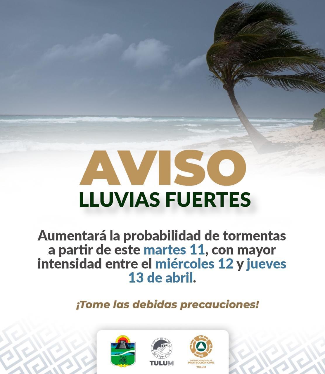 Autoridades municipales de Tulum advirtieron este martes sobre lluvias fuertes en el municipio y en la zona norte del estado.