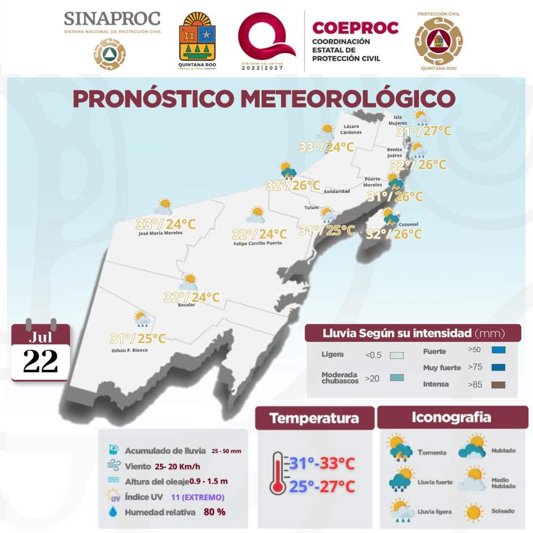 El ambiente será muy caluroso durante el día Cancún (Marcrix Noticias)-TIEMPO PROBABLE PARA EL ESTADO DE QUINTANA ROO: 1.- BENITO JUÁREZ.- Cielo parcialmente nublado, lluvias dispersas y chubascos ocasionales. Ambiente…