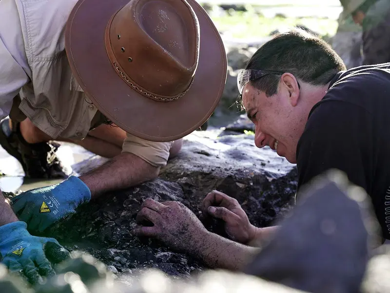 Paleontólogos trabajan de prisa antes de que suba la marea en una playa de la costa central de Chile: rescatan los restos fósiles de un singular reptil marino que vivió…