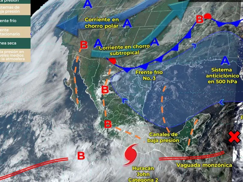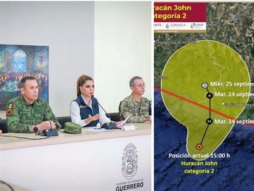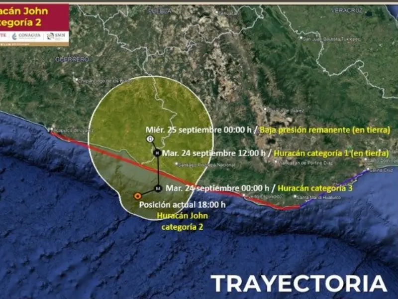 El centro del huracán John, de categoría 2, se localiza a 45 km al sur de Punta Maldonado, Guerrero, y a 105 km al oeste-suroeste de Lagunas de Chacahua, Oaxaca,…