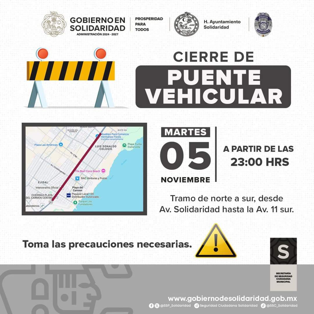 Playa del Carmen(Marcrix Noticias).- La Secretaría de Seguridad Ciudadana de Playa del Carmen informó sobre el cierre del Puente Vehicular.