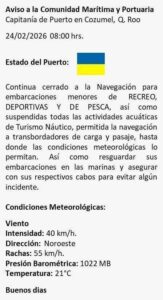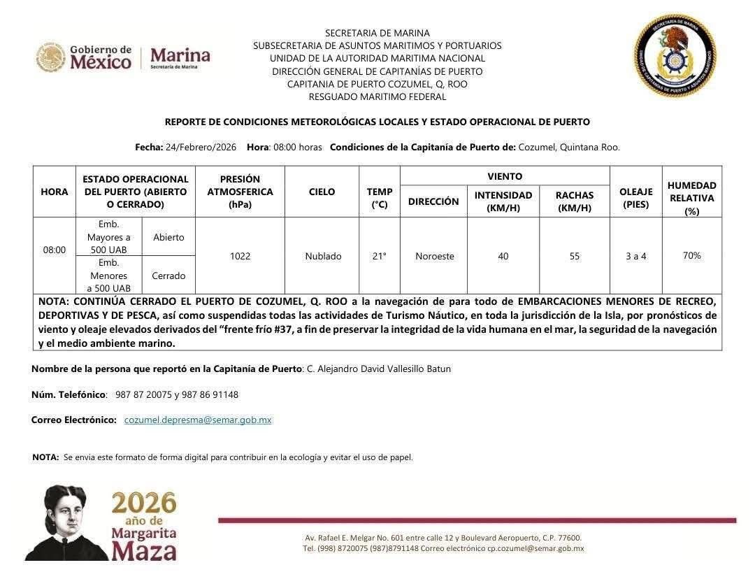 Cozumel ( Marcrix Noticias).- La Capitanía de Puerto de Cozumel informó que el puerto permanece cerrado para embarcaciones menores de recreo, deportivas y de pesca, así como para todas las actividades de turismo náutico, como medida preventiva ante las condiciones generadas por el Frente Frío 37.