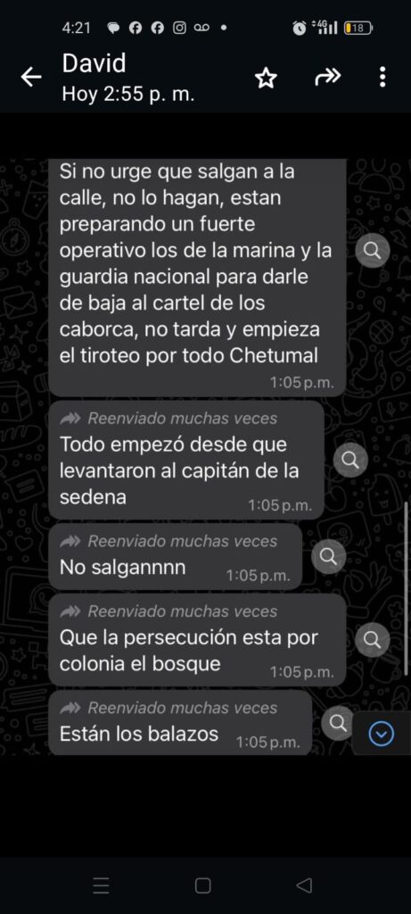 Vía la red social del WhatsApp un grupo criminal del norte del país está “alertando” a los ciudadanos de Chetumal a no salir a las calles a partir de las 22 horas, ya que presuntamente han llegado para “limpiar la ciudad” y poner orden, ante los narcotraficantes que actualmente operan con toda impunidad y atacan hasta a los civiles. Informan que los van a cazar y torturar, pero que no se meterán con gente inocente, al menos que se desobedezca la orden de no salir en las noches.
