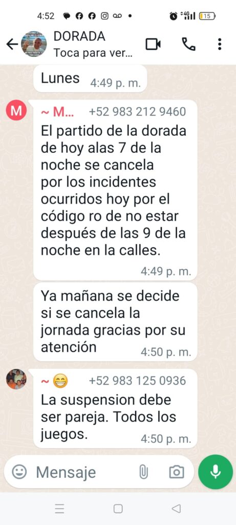 Ante tales amenazas, diversas actividades se han ido suspendiendo para la tarde noche de este lunes en Chetumal, como por ejemplo en la liga Dorada de Futbol de más de 50 años en el estadio 10 de Abril se suspendieron, el Colegio Latino suspendió actividades, el Club de Leones de igual manera, todos ante el miedo y a la espera de que las autoridades hagan algo.