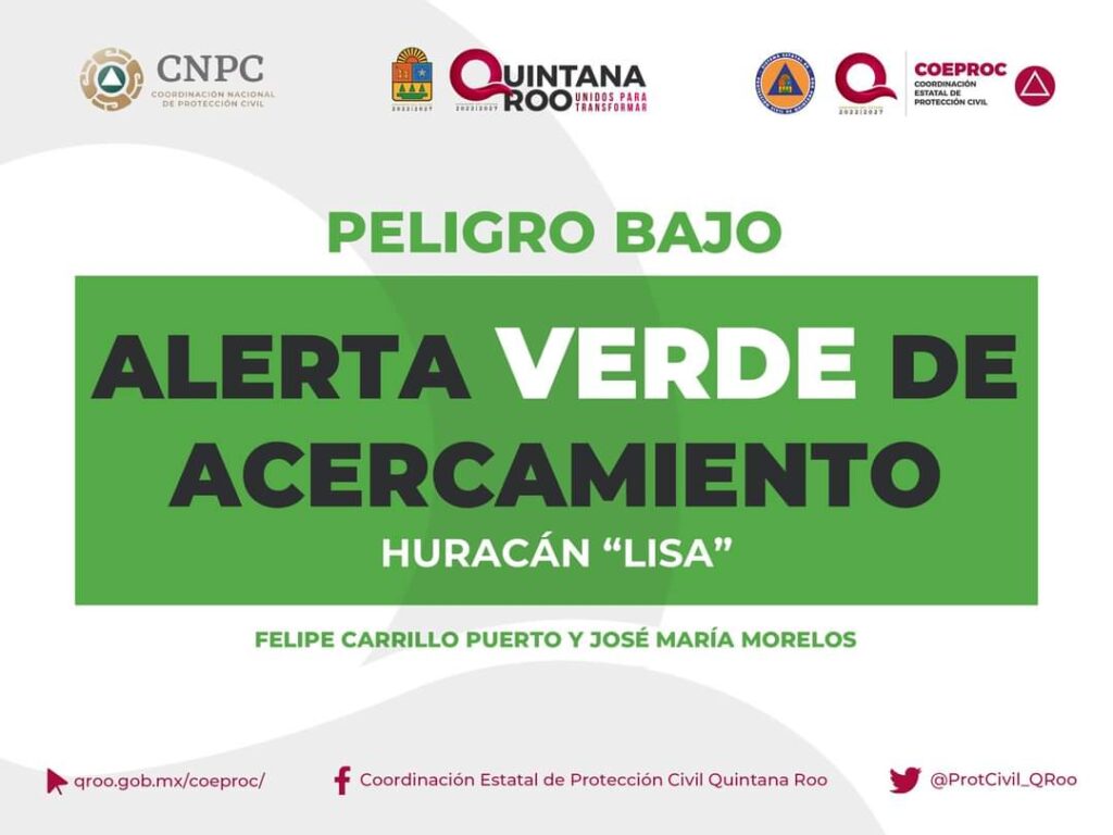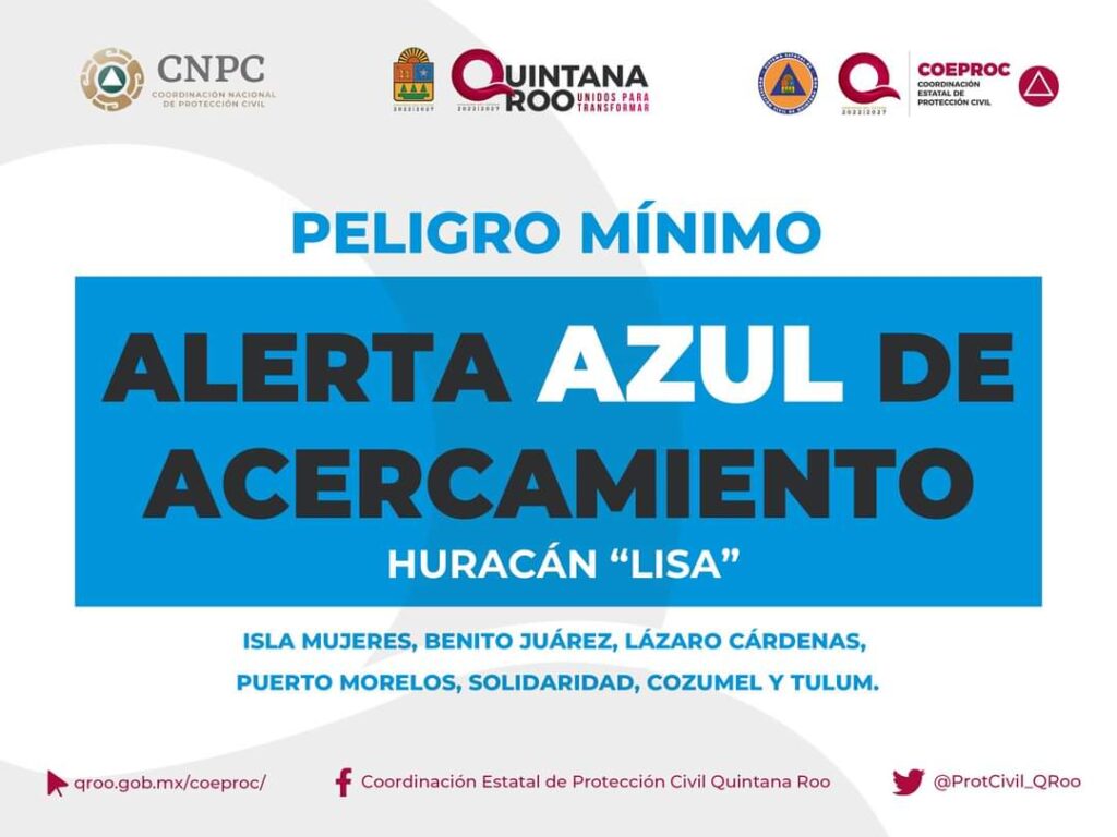 Chetumal(Marcrix Noticias).- Con el pasar de las horas, el Huracán Lisa continúa acercándose a las costas de Quintana Roo, por lo que esta mañana la Coordinación Nacional de Protección Civil y la Coordinación Estatal de Protección Civil Quintana Roo activaron la Alerta Amarilla en la Zona Sur, es decir, los municipios de Othón P. Blanco y Bacalar.