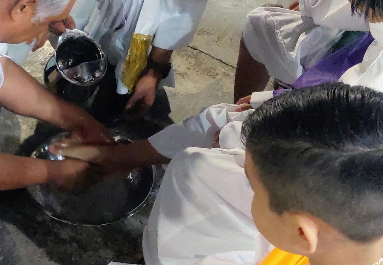 La misa comenzó después de las 8:30 de la noche, ahí el presbítero David Martín Leal, lavó los pies a los discípulos y posteriormente se conmemoró la institución de la Eucaristía, la Santa Misa.