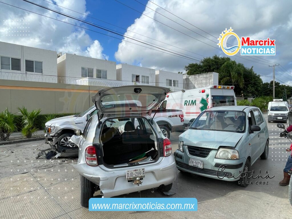 Cancún (Marcrix Noticias).- Un fuerte accidente de tránsito se registró sobre la avenida 135, a la altura del fraccionamiento Jardines del Sur 4, en el que se vieron involucrados 3 vehículos, un atos, con placas de Quintana Roo, un March, con placas de Campeche, y una camioneta 4×4, tipo lobo con placas de Nuevo Laredo.
