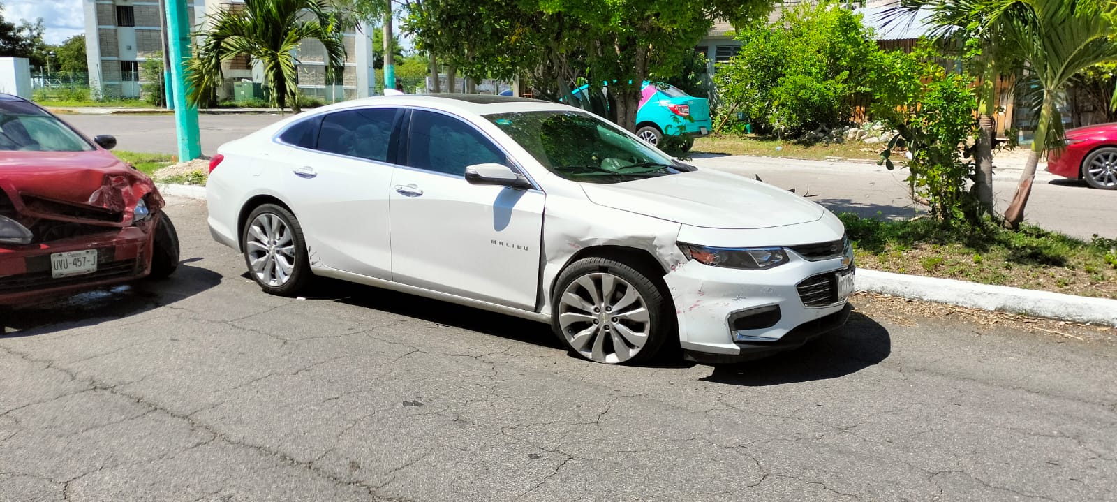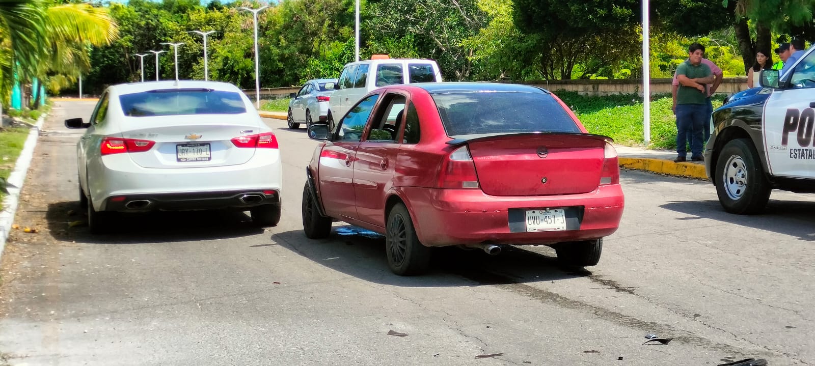 El automóvil Chevrolet tipo Monza color vino salía de la UAQROO sobre calle Cedro y al subir la pendiente no realizó su alto total por lo que fue colisionado por el automóvil Chevrolet Malibú color blanco de reciente modelo.