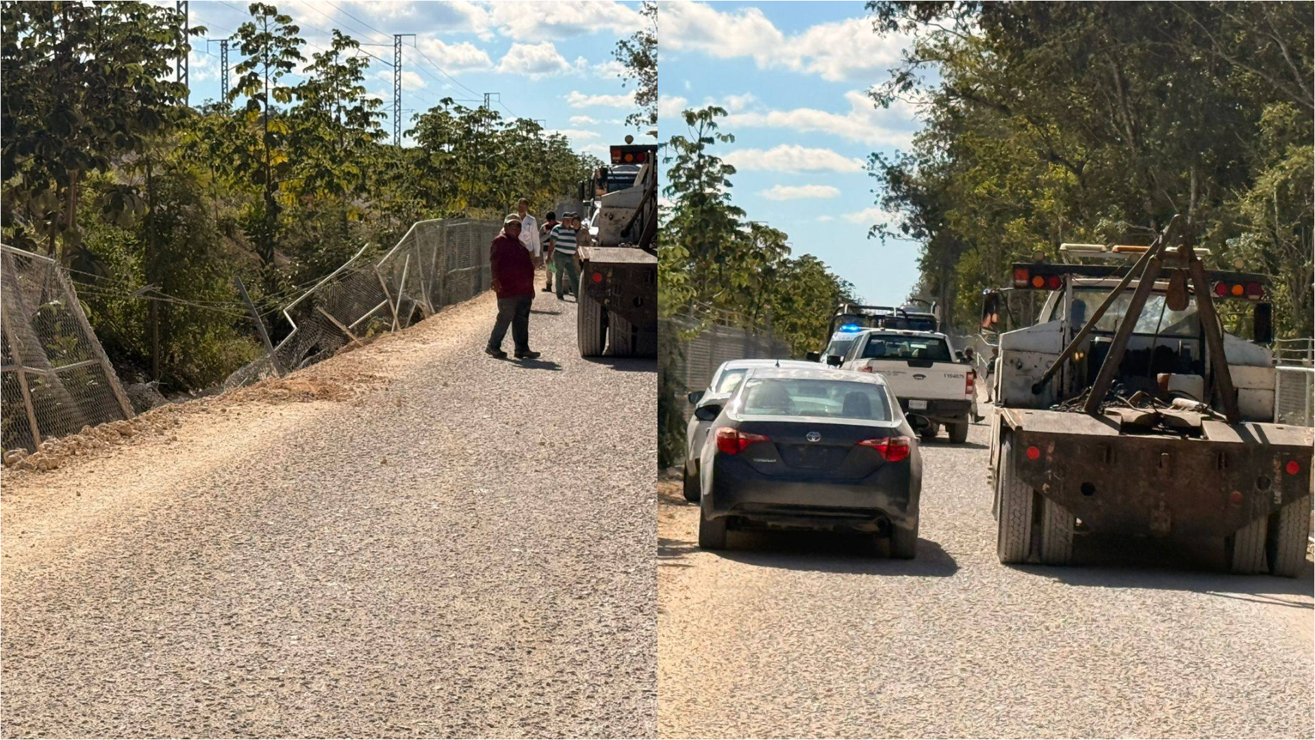 Tras el impacto, uno de los camiones salió del camino y terminó dentro de una zanja, ocasionando daños a la malla protectora que resguarda el derecho de vía del tren.