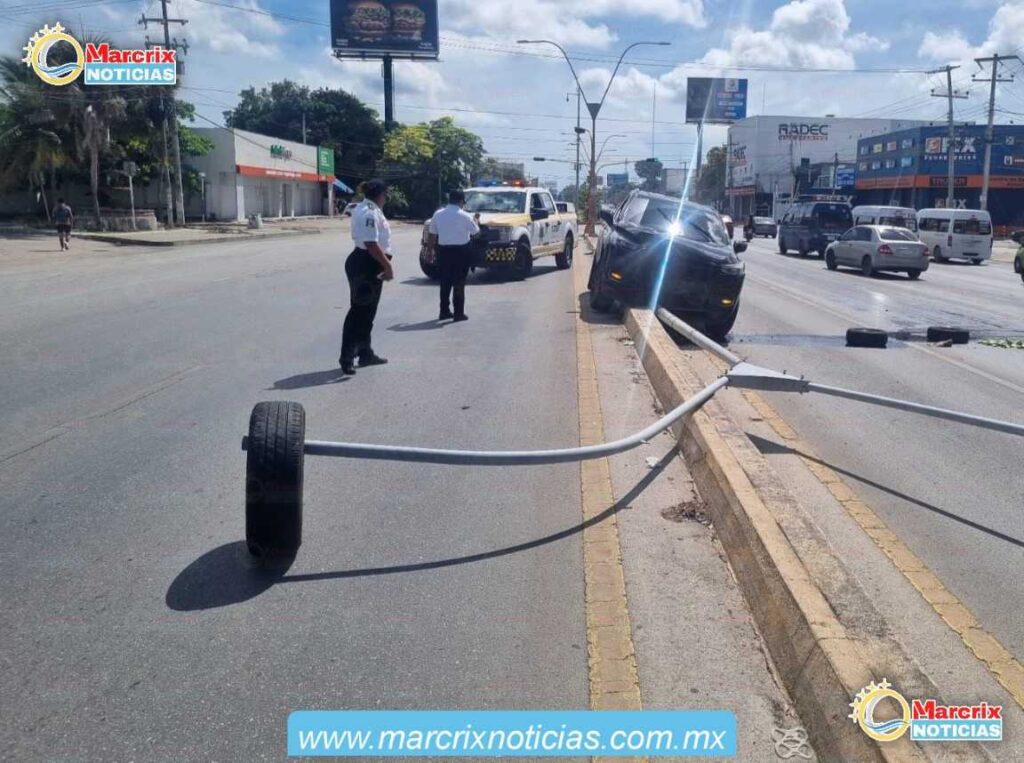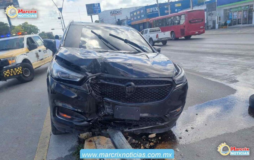 Cancún, Q. Roo (Marcrix Noticias).– El conductor de una camioneta Honda chocó a otro vehículo tipo Chevy que subió al camellón central y derribó un poste de luminaria en la avenida José López Portillo, entre Comalcaco y Xuencal, este domingo.