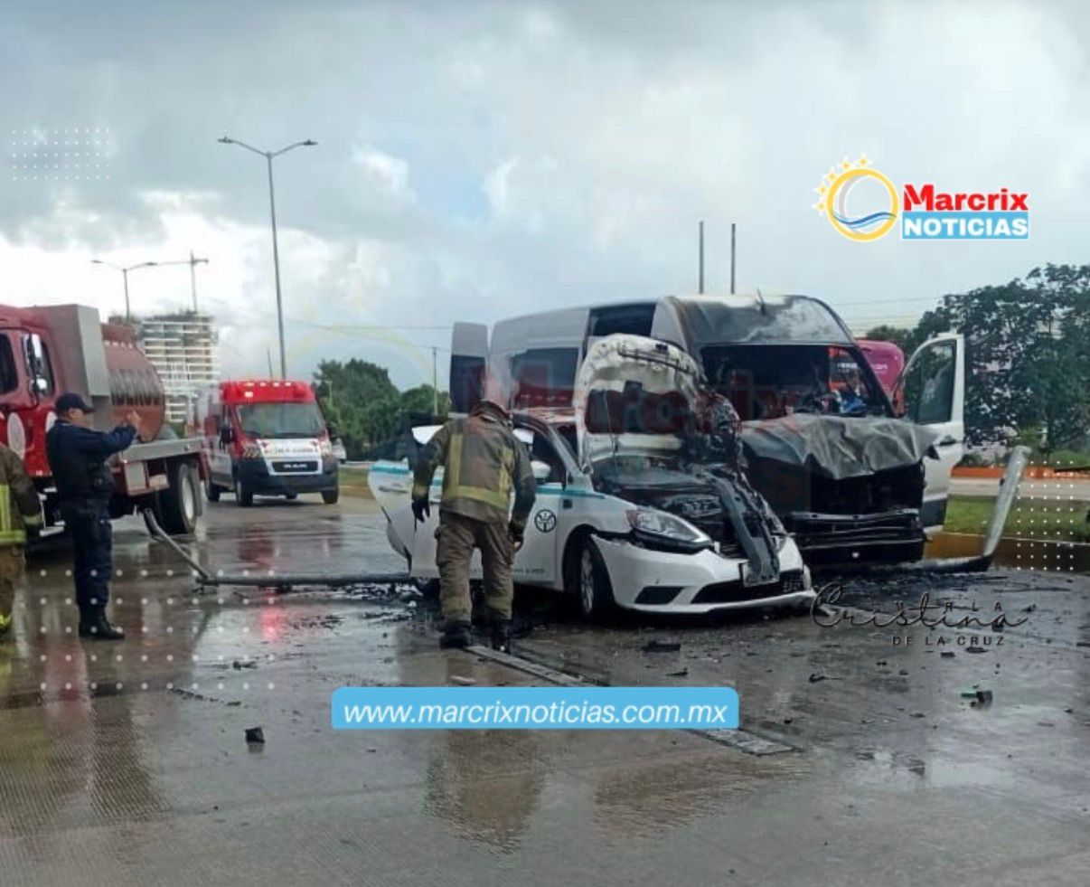 Cancún  (Marcrix Noticias).–  Una fuerte volcadura se registró la mañana de este domingo sobre el Bulevar Luis Donaldo Colosio, dejando como saldo al menos dos personas lesionadas, luego de que dos camioneta Urvan y un taxi de Playa del Carmen se vieran involucrados en un choque múltiple que terminó con una de las unidades envuelta en llamas.