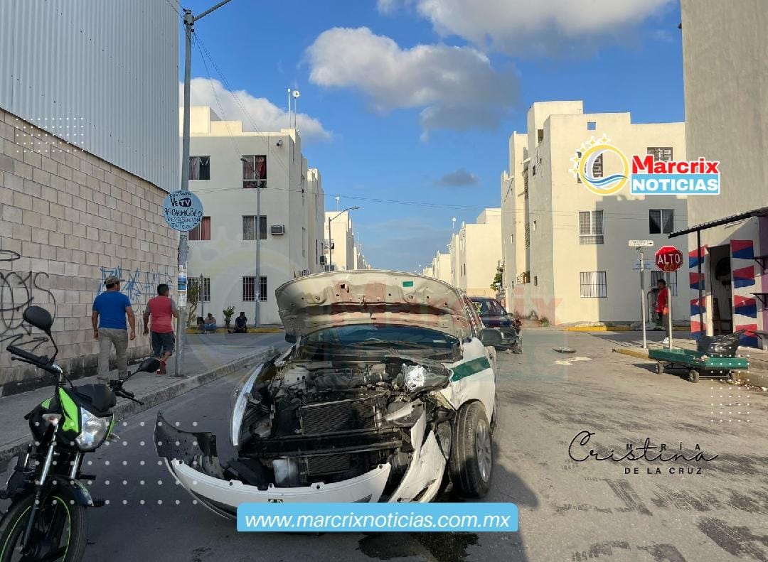 Cancún, Marcrix Noticias.- Esta tarde en Cancún en la Región 251, manzana 28, ocurrió un fuerte percance entre un taxi del Sindicato Andrés Quintana Roo y un automóvil particular color azul oscuro.