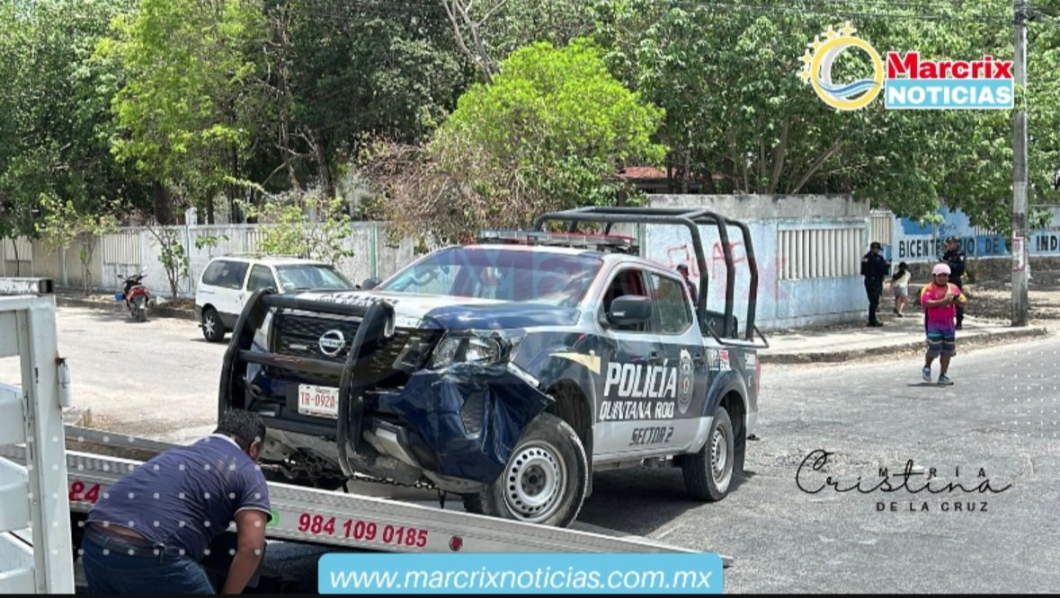 Cancún (Marcrix Noticias)-En la mañana de hoy, una patrulla de la policía de Quintana Roo, identificada con el número económico 5801, sufrió un aparatoso choque en la avenida Galaxias del Sol, dentro del fraccionamiento Galaxias del Sol, Supermanzana 253. El incidente se produjo mientras los oficiales respondían a un reporte de personas armadas en la zona.
