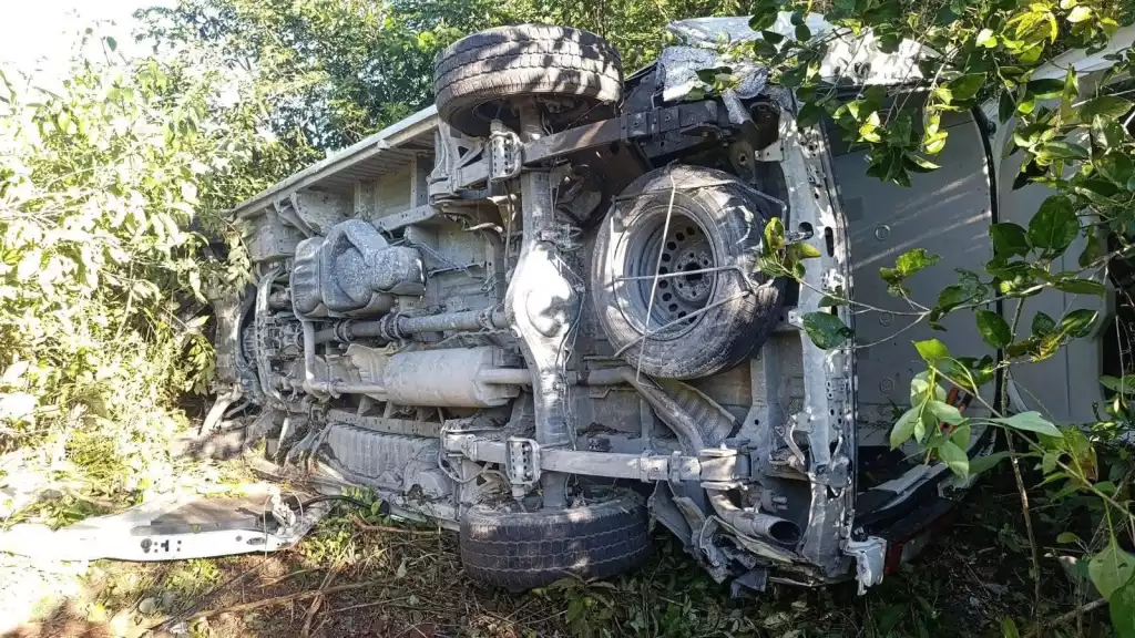 De acuerdo con información preliminar, el vehículo fue golpeado por la parte trasera por un Volkswagen Bora gris, lo que provocó que la combi perdiera el control, saliera del camino y volcara, mientras que el automóvil involucrado presentó daños considerables.
