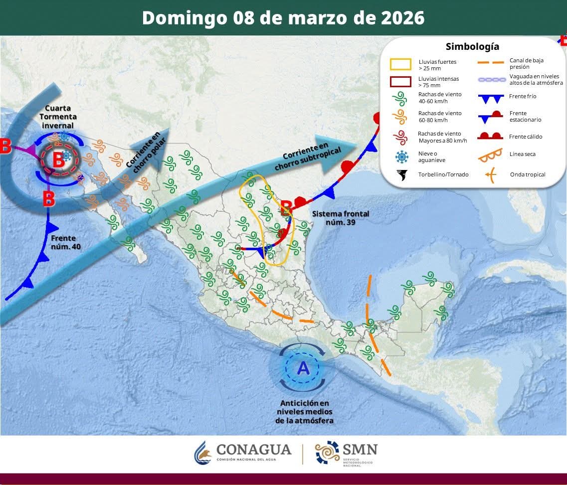 Estas condiciones están asociadas a la presencia del Frente Frío No. 39, que permanece estacionario sobre el noreste del país, además de canales de baja presión y el ingreso de humedad, factores que mantienen el potencial de lluvias y chubascos en la Península de Yucatán durante este domingo.