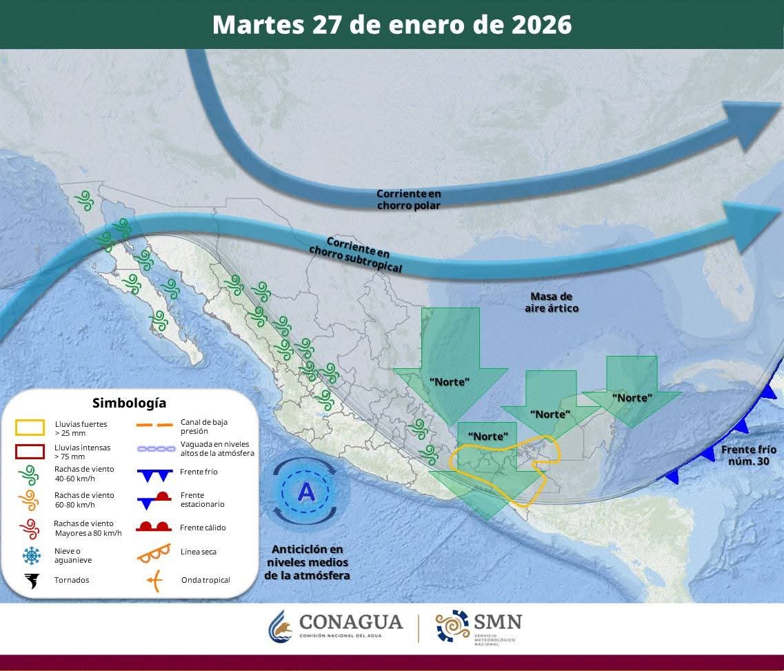 Aunque el Frente Frío número 30 dejará de afectar directamente al país al desplazarse hacia el mar Caribe, la masa de aire ártico asociada continuará favoreciendo condiciones de chubascos y lluvias en el oriente y Sureste de México.